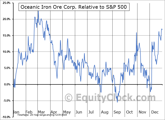 Analysis of the Oceanic Iron Ore Corp. (TSXV:FEO.V) seasonal charts above shows that a Buy Date of December 10 and a Sell Date of March 1 has resulted in a geometric average return of 19.24% above the benchmark rate of the S&P 500 Total Return Index over the past 20 years. This seasonal timeframe has shown positive results compared to the benchmark in 17 of those periods. This is a very good rate of success and the return strongly outperforms the relative buy-and-hold performance of the stock over the past 20 years by an average of 39.54% per year.