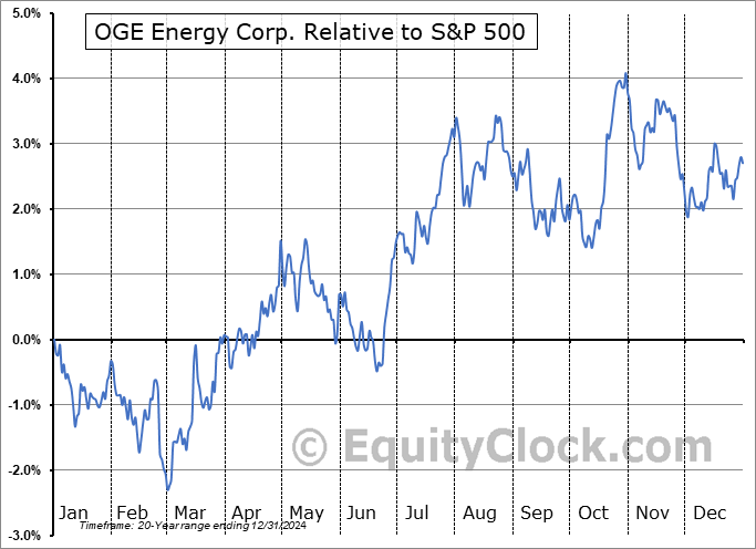 Analysis of the OGE Energy Corp. (NYSE:OGE) seasonal charts above shows that a Buy Date of June 15 and a Sell Date of October 27 has resulted in a geometric average return of 3.22% above the benchmark rate of the S&P 500 Total Return Index over the past 20 years. This seasonal timeframe has shown positive results compared to the benchmark in 14 of those periods. This is a good rate of success and the return strongly outperforms the relative buy-and-hold performance of the stock over the past 20 years by an average of 3.34% per year.