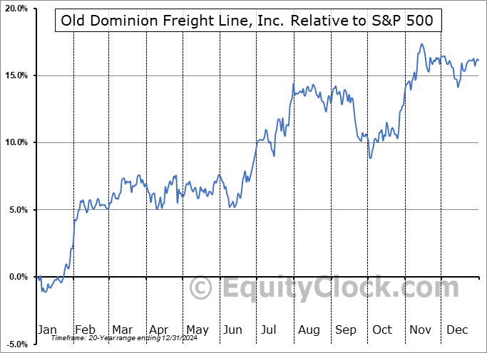 Analysis of the Old Dominion Freight Line, Inc. (NASD:ODFL) seasonal charts above shows that a Buy Date of October 26 and a Sell Date of March 13 has resulted in a geometric average return of 10.88% above the benchmark rate of the S&P 500 Total Return Index over the past 20 years. This seasonal timeframe has shown positive results compared to the benchmark in 19 of those periods. This is an excellent rate of success and the return slightly outperforms the relative buy-and-hold performance of the stock over the past 20 years by an average of 0.11% per year.