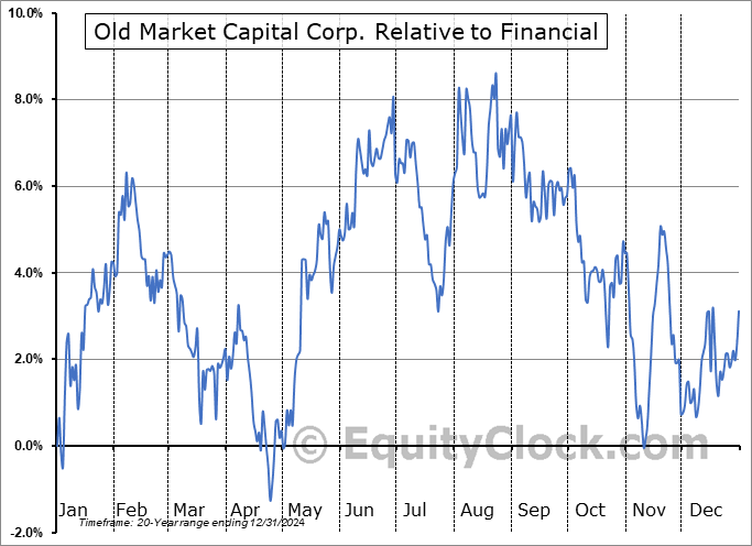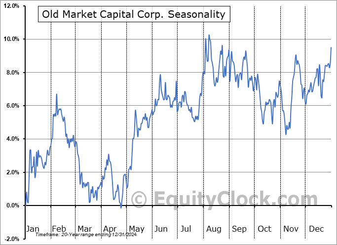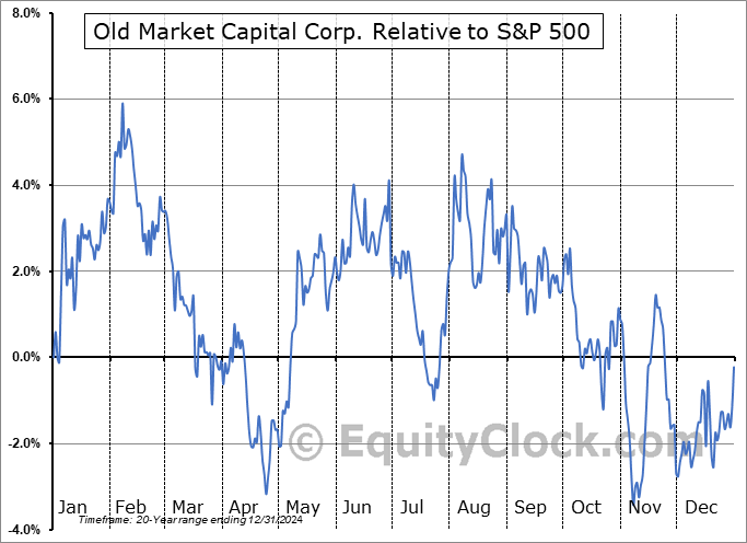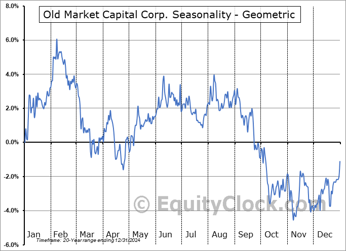Analysis of the Old Market Capital Corp. (NASD:OMCC) seasonal charts above shows that a Buy Date of November 7 and a Sell Date of February 12 has resulted in a geometric average return of 6.43% above the benchmark rate of the S&P 500 Total Return Index over the past 20 years. This seasonal timeframe has shown positive results compared to the benchmark in 14 of those periods. This is a good rate of success and the return strongly outperforms the relative buy-and-hold performance of the stock over the past 20 years by an average of 16.86% per year.