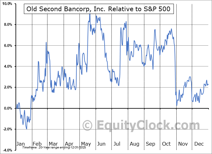 Analysis of the Old Second Bancorp, Inc. (NASD:OSBC) seasonal charts above shows that a Buy Date of July 24 and a Sell Date of November 26 has resulted in a geometric average return of 5.99% above the benchmark rate of the S&P 500 Total Return Index over the past 20 years. This seasonal timeframe has shown positive results compared to the benchmark in 14 of those periods. This is a good rate of success and the return strongly outperforms the relative buy-and-hold performance of the stock over the past 20 years by an average of 16.96% per year.