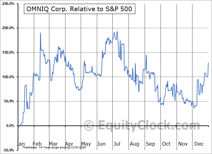Analysis of the OMNIQ Corp. (OTCMKT:OMQS) seasonal charts above shows that a Buy Date of December 28 and a Sell Date of March 22 has resulted in a geometric average return of 102.48% above the benchmark rate of the S&P 500 Total Return Index over the past 14 years. This seasonal timeframe has shown positive results compared to the benchmark in 12 of those periods. This is a very good rate of success and the return strongly outperforms the relative buy-and-hold performance of the stock over the past 14 years by an average of 124.54% per year.