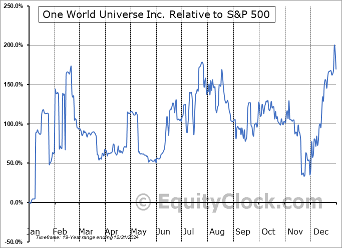 Analysis of the One World Universe Inc. (OTCMKT:OWUV) seasonal charts above shows that a Buy Date of December 2 and a Sell Date of February 27 has resulted in a geometric average return of 25.05% above the benchmark rate of the S&P 500 Total Return Index over the past 19 years. This seasonal timeframe has shown positive results compared to the benchmark in 15 of those periods. This is a good rate of success and the return strongly outperforms the relative buy-and-hold performance of the stock over the past 19 years by an average of 50.68% per year.