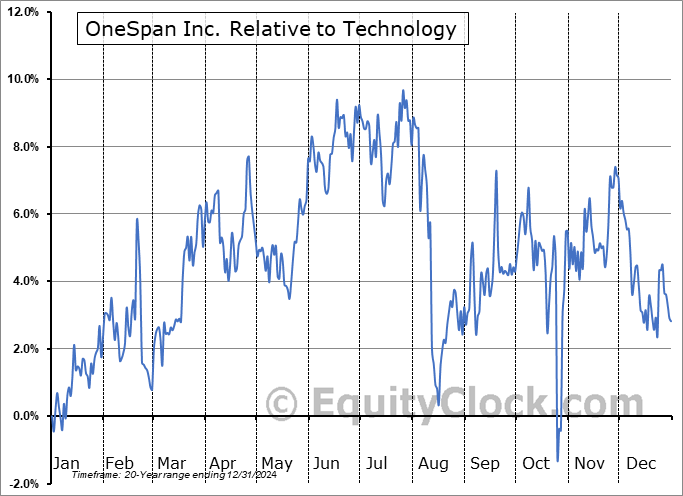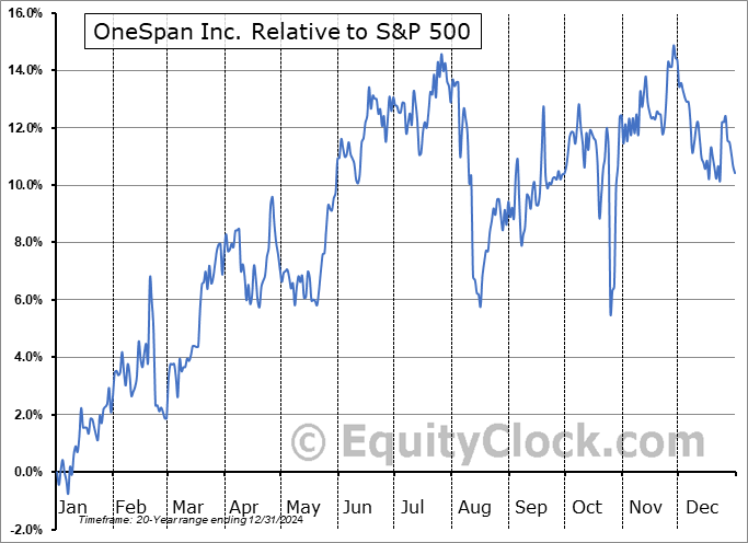 Analysis of the OneSpan Inc. (NASD:OSPN) seasonal charts above shows that a Buy Date of February 28 and a Sell Date of June 2 has resulted in a geometric average return of 8.93% above the benchmark rate of the S&P 500 Total Return Index over the past 20 years. This seasonal timeframe has shown positive results compared to the benchmark in 15 of those periods. This is a good rate of success and the return strongly outperforms the relative buy-and-hold performance of the stock over the past 20 years by an average of 13.31% per year.