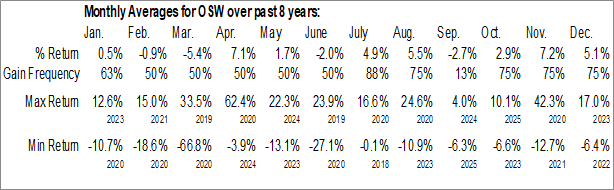A word of caution: Only 7 years of data is available for shares of OSW, perhaps insufficient to create a seasonal profile that accurately gauges the seasonal tendencies influencing the investment. Ideally, while 20 years is preferred, at least 10 years of data is required to perform a seasonal analysis that is considered to be reliable for future seasonal periods.