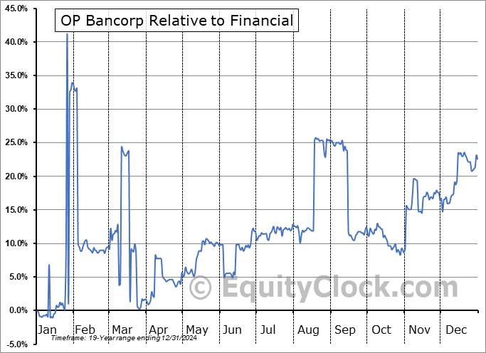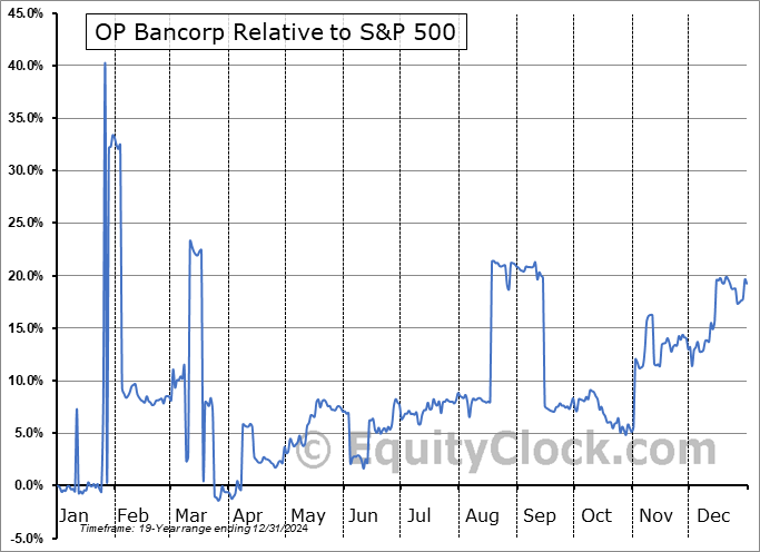 Analysis of the OP Bancorp (NASD:OPBK) seasonal charts above shows that a Buy Date of September 19 and a Sell Date of December 17 has resulted in a geometric average return of 5.2% above the benchmark rate of the S&P 500 Total Return Index over the past 19 years. This seasonal timeframe has shown positive results compared to the benchmark in 13 of those periods. This is a good rate of success and the return strongly outperforms the relative buy-and-hold performance of the stock over the past 19 years by an average of 12.18% per year.