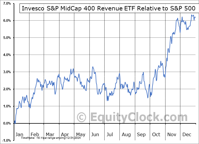 Analysis of the Invesco S&P MidCap 400 Revenue ETF (NYSE:RWK) seasonal charts above shows that a Buy Date of October 28 and a Sell Date of March 4 has resulted in a geometric average return of 3.85% above the benchmark rate of the S&P 500 Total Return Index over the past 16 years. This seasonal timeframe has shown positive results compared to the benchmark in 14 of those periods. This is a very good rate of success and the return strongly outperforms the relative buy-and-hold performance of the stock over the past 16 years by an average of 3.89% per year.