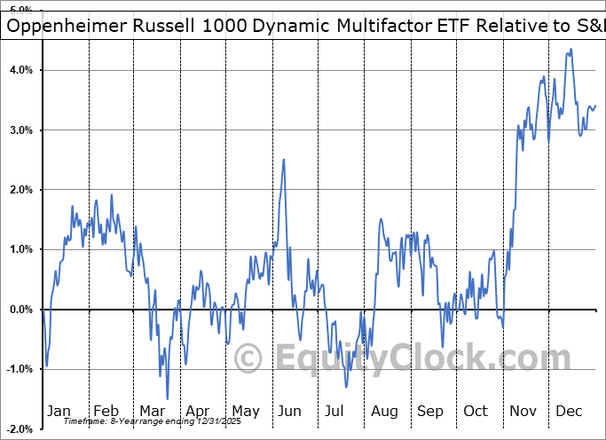 Analysis of the Oppenheimer Russell 1000 Dynamic Multifactor ETF (AMEX:OMFL) seasonal charts above shows that a Buy Date of February 10 and a Sell Date of May 9 has resulted in a geometric average return of 2.3% above the benchmark rate of the S&P 500 Total Return Index over the past 7 years. This seasonal timeframe has shown positive results compared to the benchmark in 8 of those periods. This is an excellent rate of success and the return strongly outperforms the relative buy-and-hold performance of the stock over the past 7 years by an average of 3.65% per year.