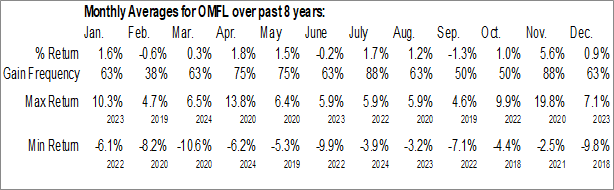 A word of caution: Only 7 years of data is available for shares of OMFL, perhaps insufficient to create a seasonal profile that accurately gauges the seasonal tendencies influencing the investment. Ideally, while 20 years is preferred, at least 10 years of data is required to perform a seasonal analysis that is considered to be reliable for future seasonal periods.