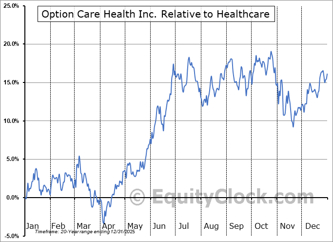 Analysis of the Option Care Health Inc. (NASD:OPCH) seasonal charts above shows that a Buy Date of November 21 and a Sell Date of February 23 has resulted in a geometric average return of 7.15% above the benchmark rate of the S&P 500 Total Return Index over the past 20 years. This seasonal timeframe has shown positive results compared to the benchmark in 14 of those periods. This is a good rate of success and the return strongly outperforms the relative buy-and-hold performance of the stock over the past 20 years by an average of 16.78% per year.