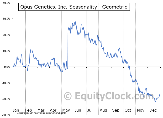 Analysis of the Opus Genetics, Inc. (NASD:IRD) seasonal charts above shows that a Buy Date of December 18 and a Sell Date of March 7 has resulted in a geometric average return of 2.33% above the benchmark rate of the S&P 500 Total Return Index over the past 20 years. This seasonal timeframe has shown positive results compared to the benchmark in 14 of those periods. This is a good rate of success and the return strongly outperforms the relative buy-and-hold performance of the stock over the past 20 years by an average of 25.1% per year.