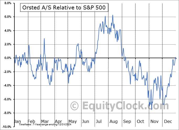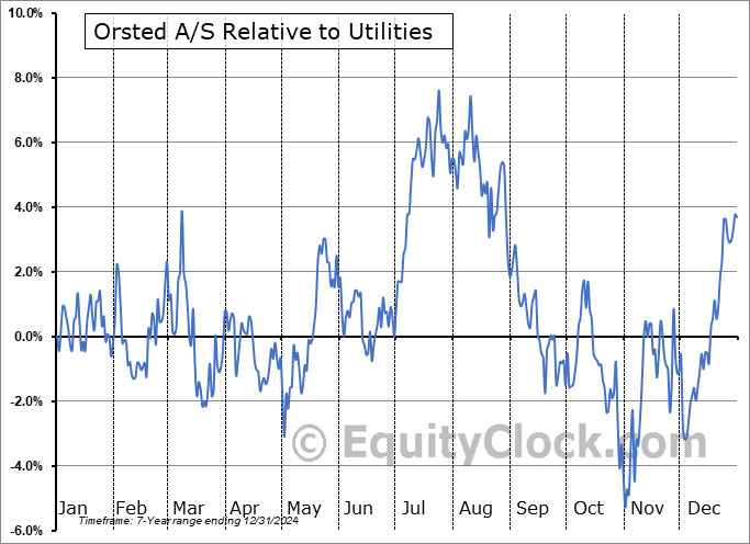 Analysis of the Orsted A/S (OTCMKT:DOGEF) seasonal charts above shows that a Buy Date of November 4 and a Sell Date of February 3 has resulted in a geometric average return of 7.15% above the benchmark rate of the S&P 500 Total Return Index over the past 7 years. This seasonal timeframe has shown positive results compared to the benchmark in 6 of those periods. This is a very good rate of success and the return strongly outperforms the relative buy-and-hold performance of the stock over the past 7 years by an average of 20.15% per year.