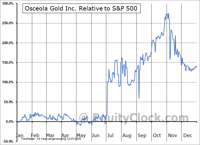 Analysis of the Osceola Gold Inc. (OTCMKT:OSCI) seasonal charts above shows that a Buy Date of July 29 and a Sell Date of October 21 has resulted in a geometric average return of 35.31% above the benchmark rate of the S&P 500 Total Return Index over the past 14 years. This seasonal timeframe has shown positive results compared to the benchmark in 11 of those periods. This is a good rate of success and the return strongly outperforms the relative buy-and-hold performance of the stock over the past 14 years by an average of 49.18% per year.
