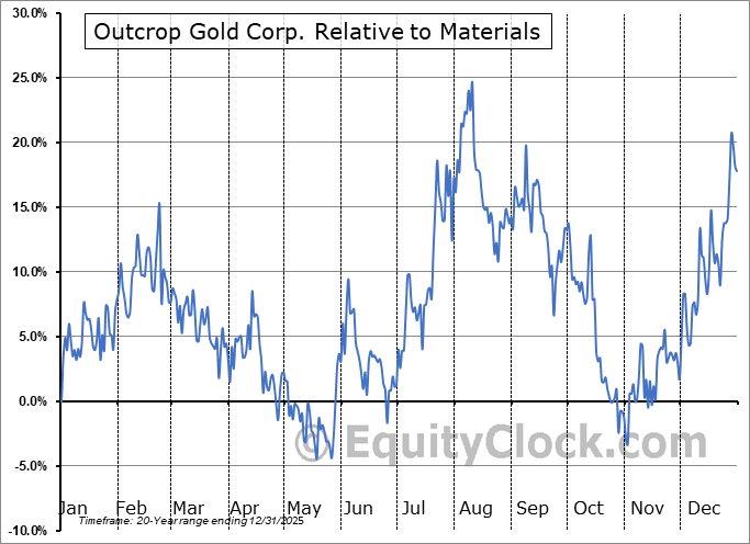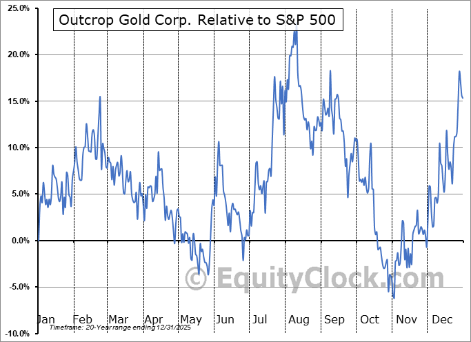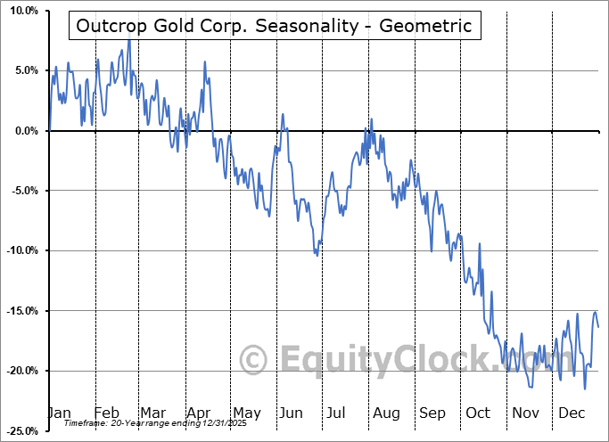 Analysis of the Outcrop Gold Corp. (OTCMKT:OCGSF) seasonal charts above shows that a Buy Date of December 15 and a Sell Date of April 15 has resulted in a geometric average return of 5.91% above the benchmark rate of the S&P 500 Total Return Index over the past 20 years. This seasonal timeframe has shown positive results compared to the benchmark in 14 of those periods. This is a good rate of success and the return strongly outperforms the relative buy-and-hold performance of the stock over the past 20 years by an average of 30.54% per year.