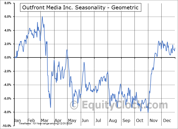 Analysis of the Outfront Media Inc. (NYSE:OUT) seasonal charts above shows that a Buy Date of October 31 and a Sell Date of January 28 has resulted in a geometric average return of 8.86% above the benchmark rate of the S&P 500 Total Return Index over the past 10 years. This seasonal timeframe has shown positive results compared to the benchmark in 9 of those periods. This is an excellent rate of success and the return strongly outperforms the relative buy-and-hold performance of the stock over the past 10 years by an average of 19.09% per year.