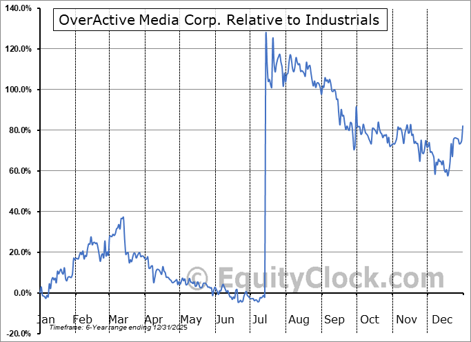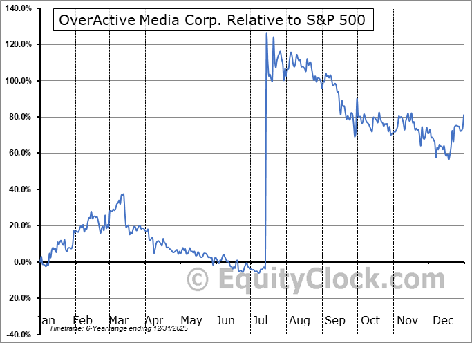 Analysis of the OverActive Media Corp. (TSXV:OAM.V) seasonal charts above shows that a Buy Date of November 24 and a Sell Date of March 13 has resulted in a geometric average return of 47.73% above the benchmark rate of the S&P 500 Total Return Index over the past 5 years. This seasonal timeframe has shown positive results compared to the benchmark in 4 of those periods. This is a very good rate of success and the return strongly outperforms the relative buy-and-hold performance of the stock over the past 5 years by an average of 56.34% per year.
