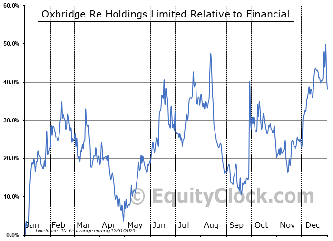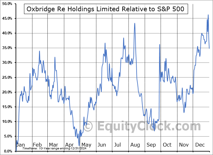 Analysis of the Oxbridge Re Holdings Limited (NASD:OXBR) seasonal charts above shows that a Buy Date of December 27 and a Sell Date of March 16 has resulted in a geometric average return of 23.66% above the benchmark rate of the S&P 500 Total Return Index over the past 10 years. This seasonal timeframe has shown positive results compared to the benchmark in 8 of those periods. This is a very good rate of success and the return strongly outperforms the relative buy-and-hold performance of the stock over the past 10 years by an average of 36.87% per year.