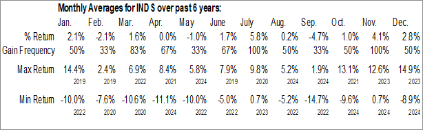 A word of caution: Only 6 years of data is available for shares of INDS, perhaps insufficient to create a seasonal profile that accurately gauges the seasonal tendencies influencing the investment. Ideally, while 20 years is preferred, at least 10 years of data is required to perform a seasonal analysis that is considered to be reliable for future seasonal periods.