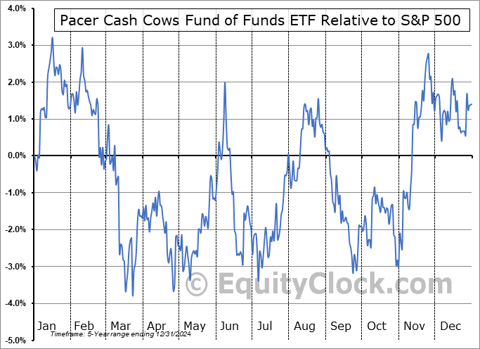 Analysis of the Pacer Cash Cows Fund of Funds ETF (NASD:HERD) seasonal charts above shows that a Buy Date of September 2 and a Sell Date of January 16 has resulted in a geometric average return of 5.27% above the benchmark rate of the S&P 500 Total Return Index over the past 5 years. This seasonal timeframe has shown positive results compared to the benchmark in 4 of those periods. This is a very good rate of success and the return strongly outperforms the relative buy-and-hold performance of the stock over the past 5 years by an average of 8.79% per year.