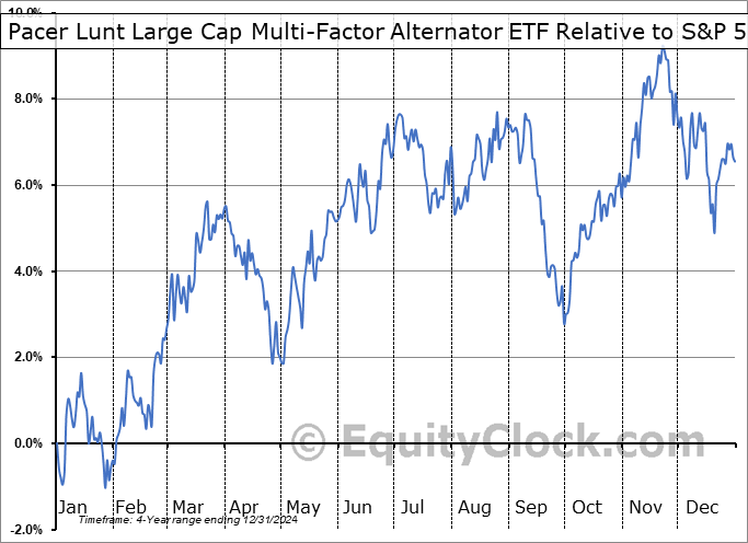 Analysis of the Pacer Lunt Large Cap Multi-Factor Alternator ETF (AMEX:PALC) seasonal charts above shows that a Buy Date of February 2 and a Sell Date of June 14 has resulted in a geometric average return of 5.59% above the benchmark rate of the S&P 500 Total Return Index over the past 4 years. This seasonal timeframe has shown positive results compared to the benchmark in 4 of those periods. This is an excellent rate of success and the return strongly outperforms the relative buy-and-hold performance of the stock over the past 4 years by an average of 4.79% per year.