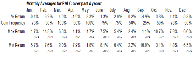 A word of caution: Only 4 years of data is available for shares of PALC, perhaps insufficient to create a seasonal profile that accurately gauges the seasonal tendencies influencing the investment. Ideally, while 20 years is preferred, at least 10 years of data is required to perform a seasonal analysis that is considered to be reliable for future seasonal periods.