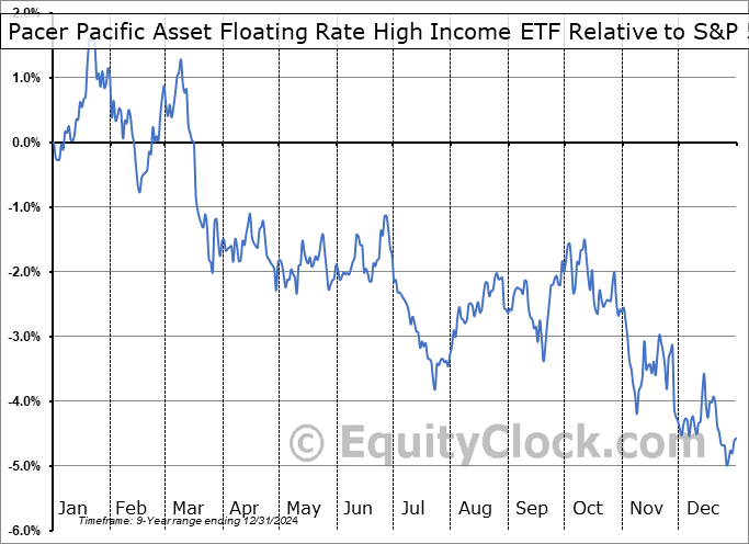 Analysis of the Pacer Pacific Asset Floating Rate High Income ETF (AMEX:FLRT) seasonal charts above shows that a Buy Date of July 23 and a Sell Date of October 12 has resulted in a geometric average return of 1.2% above the benchmark rate of the S&P 500 Total Return Index over the past 9 years. This seasonal timeframe has shown positive results compared to the benchmark in 6 of those periods. This is a good rate of success and the return strongly outperforms the relative buy-and-hold performance of the stock over the past 9 years by an average of 9.55% per year.
