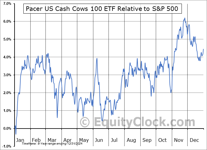 Analysis of the Pacer US Cash Cows 100 ETF (AMEX:COWZ) seasonal charts above shows that a Buy Date of July 10 and a Sell Date of November 29 has resulted in a geometric average return of 2.62% above the benchmark rate of the S&P 500 Total Return Index over the past 7 years. This seasonal timeframe has shown positive results compared to the benchmark in 7 of those periods. This is an excellent rate of success and the return strongly outperforms the relative buy-and-hold performance of the stock over the past 7 years by an average of 4.12% per year.