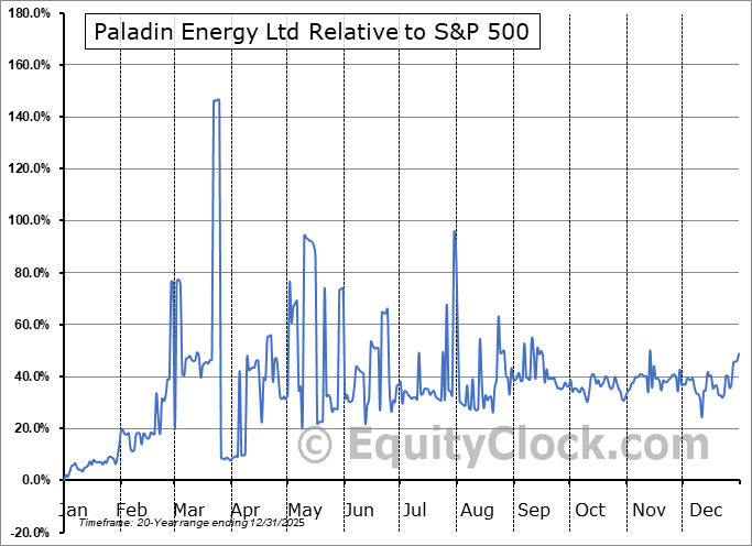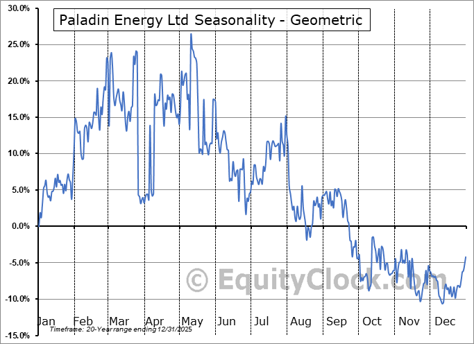 Analysis of the Paladin Energy Ltd (OTCMKT:PALAF) seasonal charts above shows that a Buy Date of December 14 and a Sell Date of March 4 has resulted in a geometric average return of 25.06% above the benchmark rate of the S&P 500 Total Return Index over the past 20 years. This seasonal timeframe has shown positive results compared to the benchmark in 15 of those periods. This is a good rate of success and the return strongly outperforms the relative buy-and-hold performance of the stock over the past 20 years by an average of 39.01% per year.
