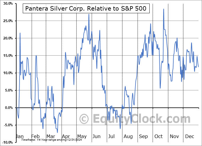 Analysis of the Pantera Silver Corp. (TSXV:PNTR.V) seasonal charts above shows that a Buy Date of August 18 and a Sell Date of December 20 has resulted in a geometric average return of 23.78% above the benchmark rate of the S&P 500 Total Return Index over the past 14 years. This seasonal timeframe has shown positive results compared to the benchmark in 10 of those periods. This is a good rate of success and the return strongly outperforms the relative buy-and-hold performance of the stock over the past 14 years by an average of 42.6% per year.