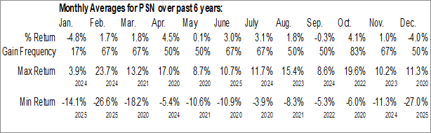 A word of caution: Only 6 years of data is available for shares of PSN, perhaps insufficient to create a seasonal profile that accurately gauges the seasonal tendencies influencing the investment. Ideally, while 20 years is preferred, at least 10 years of data is required to perform a seasonal analysis that is considered to be reliable for future seasonal periods.