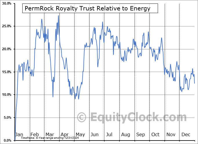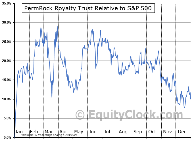 Analysis of the PermRock Royalty Trust (NYSE:PRT) seasonal charts above shows that a Buy Date of March 18 and a Sell Date of June 8 has resulted in a geometric average return of 14.53% above the benchmark rate of the S&P 500 Total Return Index over the past 6 years. This seasonal timeframe has shown positive results compared to the benchmark in 4 of those periods. This is a good rate of success and the return strongly outperforms the relative buy-and-hold performance of the stock over the past 6 years by an average of 34.21% per year.