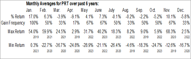 A word of caution: Only 6 years of data is available for shares of PRT, perhaps insufficient to create a seasonal profile that accurately gauges the seasonal tendencies influencing the investment. Ideally, while 20 years is preferred, at least 10 years of data is required to perform a seasonal analysis that is considered to be reliable for future seasonal periods.