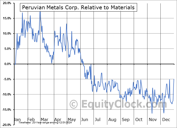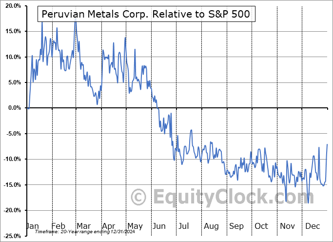 Analysis of the Peruvian Metals Corp. (TSXV:PER.V) seasonal charts above shows that a Buy Date of December 8 and a Sell Date of March 1 has resulted in a geometric average return of 23.37% above the benchmark rate of the S&P 500 Total Return Index over the past 20 years. This seasonal timeframe has shown positive results compared to the benchmark in 16 of those periods. This is a very good rate of success and the return strongly outperforms the relative buy-and-hold performance of the stock over the past 20 years by an average of 47.89% per year.