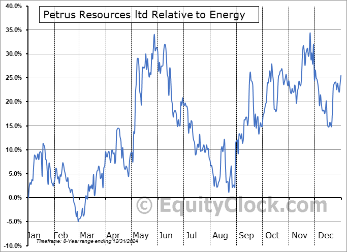 Analysis of the Petrus Resources ltd (OTCMKT:PTRUF) seasonal charts above shows that a Buy Date of August 1 and a Sell Date of October 24 has resulted in a geometric average return of 8.09% above the benchmark rate of the S&P 500 Total Return Index over the past 8 years. This seasonal timeframe has shown positive results compared to the benchmark in 6 of those periods. This is a good rate of success and the return strongly outperforms the relative buy-and-hold performance of the stock over the past 8 years by an average of 28.49% per year.