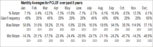 A word of caution: Only 5 years of data is available for shares of PCLOF, perhaps insufficient to create a seasonal profile that accurately gauges the seasonal tendencies influencing the investment. Ideally, while 20 years is preferred, at least 10 years of data is required to perform a seasonal analysis that is considered to be reliable for future seasonal periods.