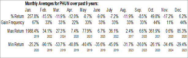 A word of caution: Only 8 years of data is available for shares of PHUN, perhaps insufficient to create a seasonal profile that accurately gauges the seasonal tendencies influencing the investment. Ideally, while 20 years is preferred, at least 10 years of data is required to perform a seasonal analysis that is considered to be reliable for future seasonal periods.