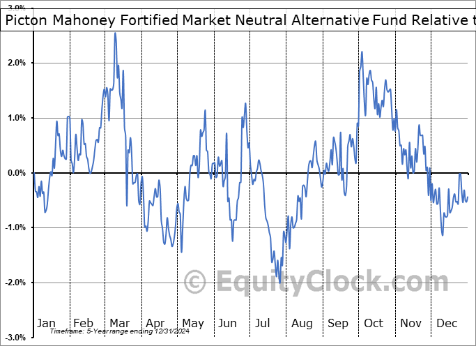 Analysis of the Picton Mahoney Fortified Market Neutral Alternative Fund (TSE:PFMN.TO) seasonal charts above shows that a Buy Date of February 9 and a Sell Date of May 12 has resulted in a geometric average return of 6.18% above the benchmark rate of the S&P 500 Total Return Index over the past 5 years. This seasonal timeframe has shown positive results compared to the benchmark in 4 of those periods. This is a very good rate of success and the return strongly outperforms the relative buy-and-hold performance of the stock over the past 5 years by an average of 10.79% per year.