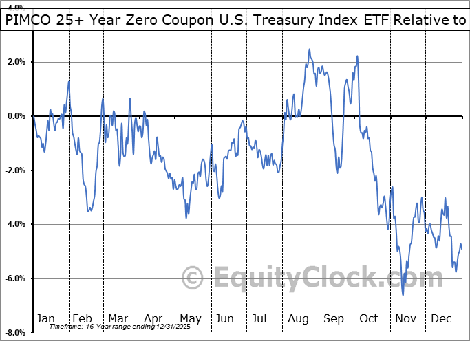 Analysis of the PIMCO 25+ Year Zero Coupon U.S. Treasury Index ETF (NYSE:ZROZ) seasonal charts above shows that a Buy Date of June 6 and a Sell Date of August 25 has resulted in a geometric average return of 4.15% above the benchmark rate of the S&P 500 Total Return Index over the past 15 years. This seasonal timeframe has shown positive results compared to the benchmark in 11 of those periods. This is a good rate of success and the return strongly outperforms the relative buy-and-hold performance of the stock over the past 15 years by an average of 13.54% per year.
