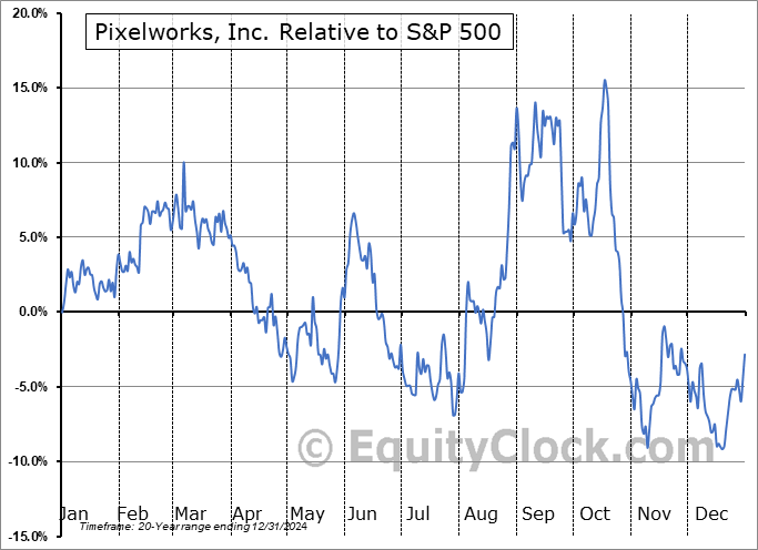 Analysis of the Pixelworks, Inc. (NASD:PXLW) seasonal charts above shows that a Buy Date of December 6 and a Sell Date of March 4 has resulted in a geometric average return of 0.79% above the benchmark rate of the S&P 500 Total Return Index over the past 20 years. This seasonal timeframe has shown positive results compared to the benchmark in 12 of those periods. This is a fair rate of success and the return strongly outperforms the relative buy-and-hold performance of the stock over the past 20 years by an average of 26% per year.