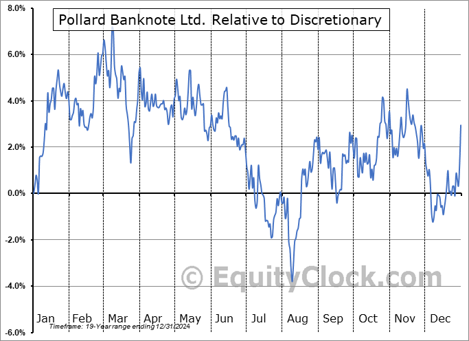 Analysis of the Pollard Banknote Ltd. (TSE:PBL.TO) seasonal charts above shows that a Buy Date of December 8 and a Sell Date of March 10 has resulted in a geometric average return of 6.47% above the benchmark rate of the S&P 500 Total Return Index over the past 19 years. This seasonal timeframe has shown positive results compared to the benchmark in 14 of those periods. This is a good rate of success and the return strongly outperforms the relative buy-and-hold performance of the stock over the past 19 years by an average of 10.17% per year.
