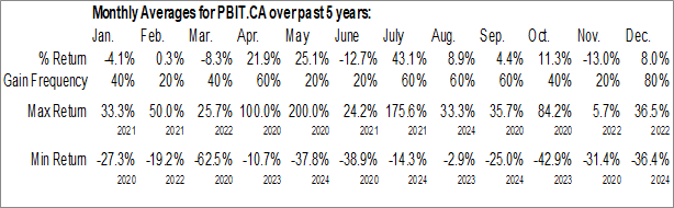 A word of caution: Only 5 years of data is available for shares of PBIT.CA, perhaps insufficient to create a seasonal profile that accurately gauges the seasonal tendencies influencing the investment. Ideally, while 20 years is preferred, at least 10 years of data is required to perform a seasonal analysis that is considered to be reliable for future seasonal periods.