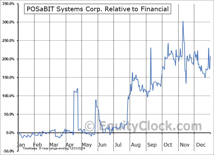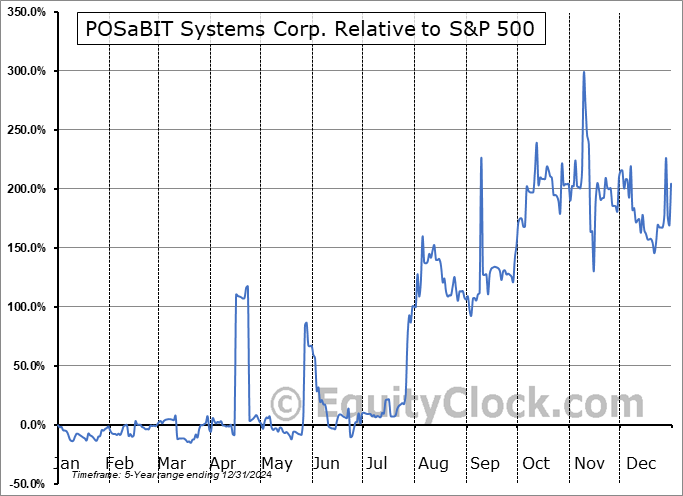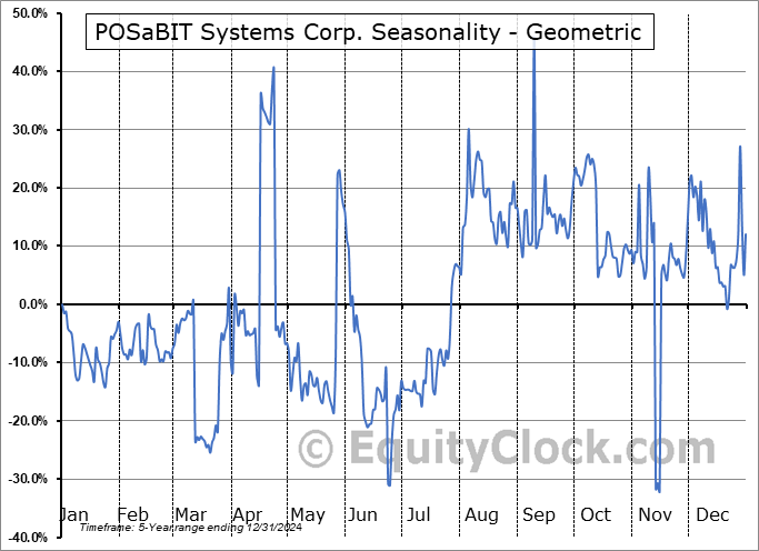 Analysis of the POSaBIT Systems Corp. (OTCMKT:POSAF) seasonal charts above shows that a Buy Date of June 12 and a Sell Date of September 9 has resulted in a geometric average return of 75.28% above the benchmark rate of the S&P 500 Total Return Index over the past 5 years. This seasonal timeframe has shown positive results compared to the benchmark in 4 of those periods. This is a very good rate of success and the return strongly outperforms the relative buy-and-hold performance of the stock over the past 5 years by an average of 77.34% per year.