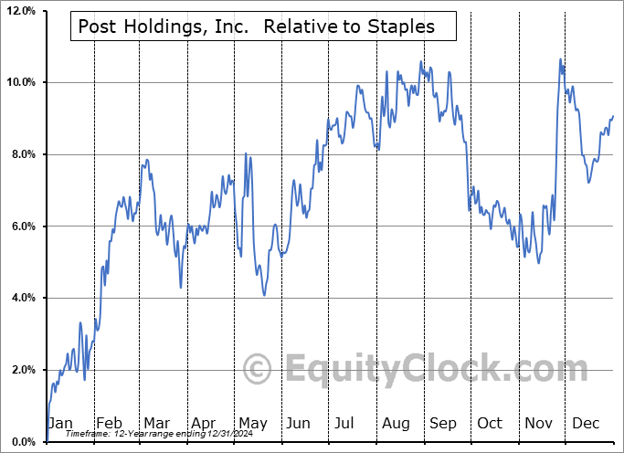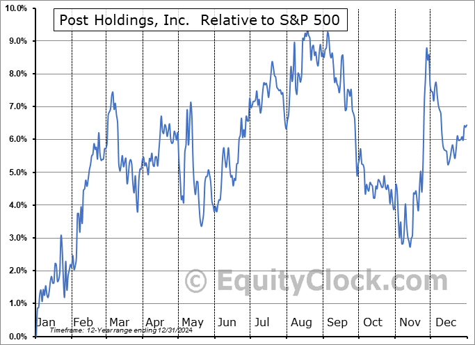 Analysis of the Post Holdings, Inc. (NYSE:POST) seasonal charts above shows that a Buy Date of December 16 and a Sell Date of March 7 has resulted in a geometric average return of 5.46% above the benchmark rate of the S&P 500 Total Return Index over the past 12 years. This seasonal timeframe has shown positive results compared to the benchmark in 11 of those periods. This is an excellent rate of success and the return strongly outperforms the relative buy-and-hold performance of the stock over the past 12 years by an average of 5.52% per year.