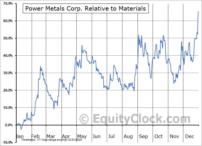 Analysis of the Power Metals Corp. (TSXV:PWM.V) seasonal charts above shows that a Buy Date of December 19 and a Sell Date of March 13 has resulted in a geometric average return of 30.48% above the benchmark rate of the S&P 500 Total Return Index over the past 17 years. This seasonal timeframe has shown positive results compared to the benchmark in 15 of those periods. This is a very good rate of success and the return strongly outperforms the relative buy-and-hold performance of the stock over the past 17 years by an average of 47.24% per year.