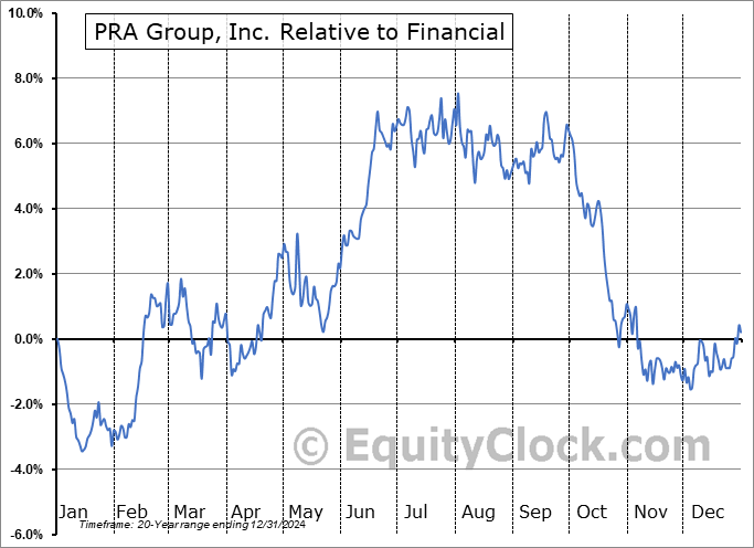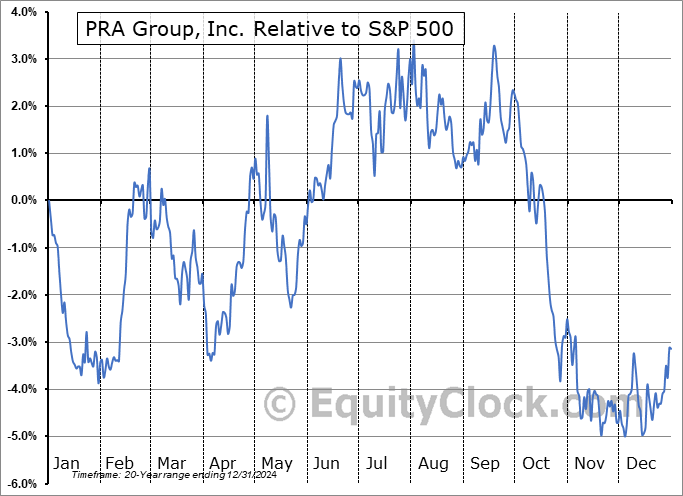 Analysis of the PRA Group, Inc. (NASD:PRAA) seasonal charts above shows that a Buy Date of February 2 and a Sell Date of May 9 has resulted in a geometric average return of 3.98% above the benchmark rate of the S&P 500 Total Return Index over the past 20 years. This seasonal timeframe has shown positive results compared to the benchmark in 15 of those periods. This is a good rate of success and the return strongly outperforms the relative buy-and-hold performance of the stock over the past 20 years by an average of 10.91% per year.