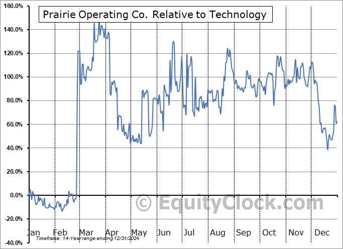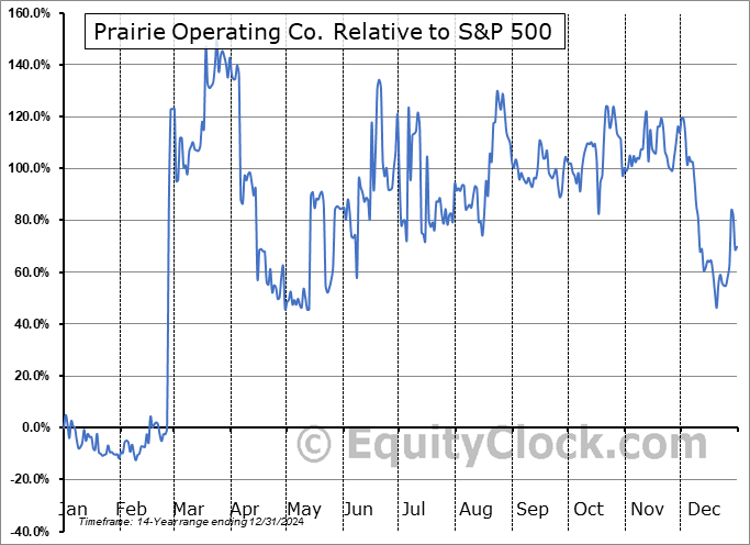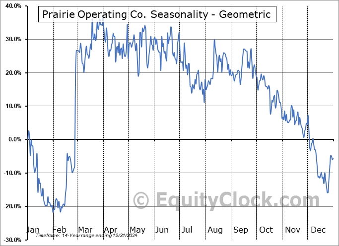 Analysis of the Prairie Operating Co. (NASD:PROP) seasonal charts above shows that a Buy Date of February 14 and a Sell Date of May 6 has resulted in a geometric average return of 59.26% above the benchmark rate of the S&P 500 Total Return Index over the past 14 years. This seasonal timeframe has shown positive results compared to the benchmark in 13 of those periods. This is an excellent rate of success and the return strongly outperforms the relative buy-and-hold performance of the stock over the past 14 years by an average of 76.21% per year.