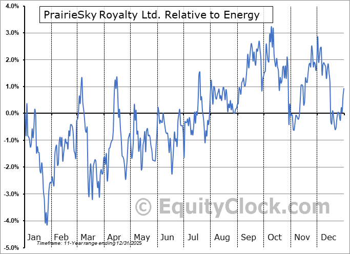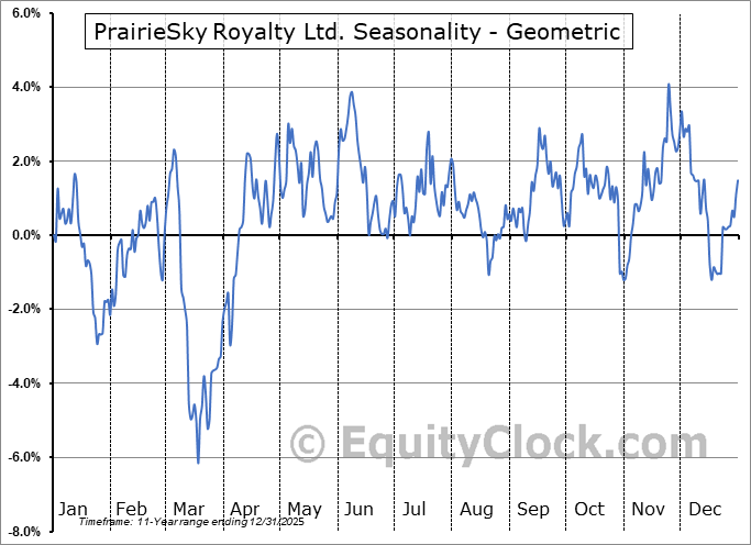Analysis of the PrairieSky Royalty Ltd. (OTCMKT:PREKF) seasonal charts above shows that a Buy Date of March 30 and a Sell Date of June 29 has resulted in a geometric average return of 0.59% above the benchmark rate of the S&P 500 Total Return Index over the past 11 years. This seasonal timeframe has shown positive results compared to the benchmark in 8 of those periods. This is a good rate of success and the return strongly outperforms the relative buy-and-hold performance of the stock over the past 11 years by an average of 11.12% per year.