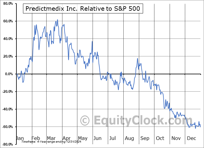 Analysis of the Predictmedix Inc. (CSE:PMED.CA) seasonal charts above shows that a Buy Date of January 13 and a Sell Date of April 3 has resulted in a geometric average return of 51.41% above the benchmark rate of the S&P 500 Total Return Index over the past 4 years. This seasonal timeframe has shown positive results compared to the benchmark in 4 of those periods. This is an excellent rate of success and the return strongly outperforms the relative buy-and-hold performance of the stock over the past 4 years by an average of 114.53% per year.