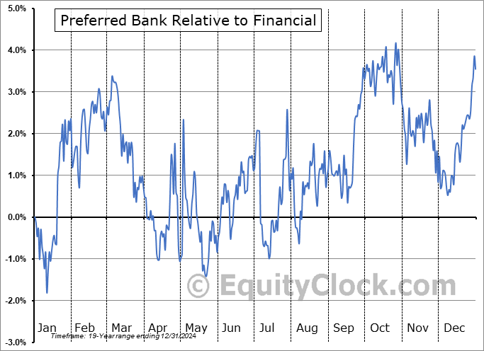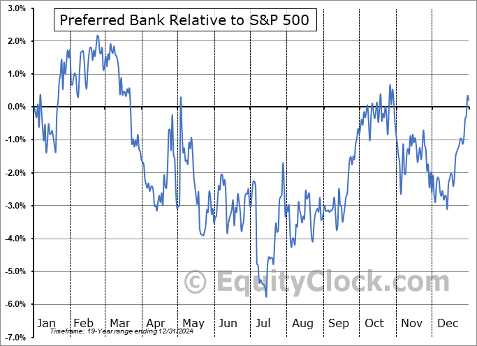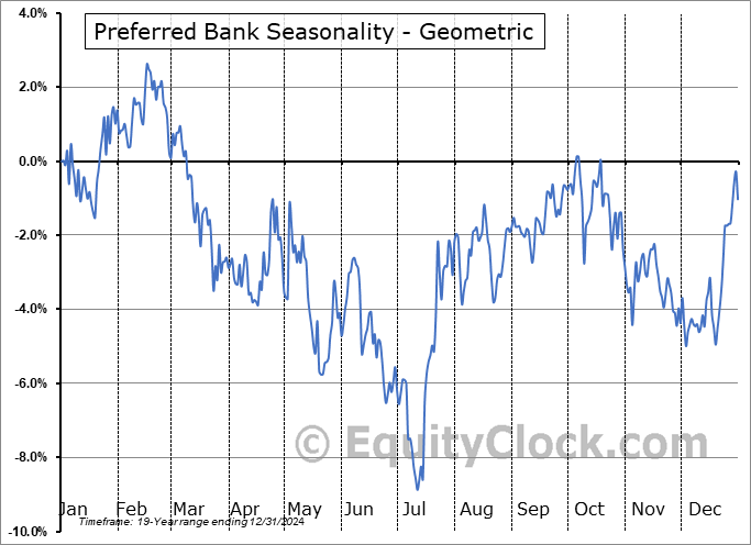 Analysis of the Preferred Bank (NASD:PFBC) seasonal charts above shows that a Buy Date of July 11 and a Sell Date of October 3 has resulted in a geometric average return of 8.07% above the benchmark rate of the S&P 500 Total Return Index over the past 19 years. This seasonal timeframe has shown positive results compared to the benchmark in 16 of those periods. This is a very good rate of success and the return strongly outperforms the relative buy-and-hold performance of the stock over the past 19 years by an average of 18.4% per year.