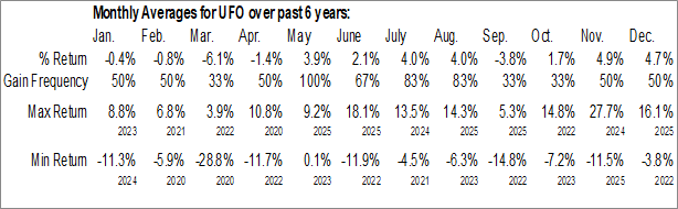 A word of caution: Only 5 years of data is available for shares of UFO, perhaps insufficient to create a seasonal profile that accurately gauges the seasonal tendencies influencing the investment. Ideally, while 20 years is preferred, at least 10 years of data is required to perform a seasonal analysis that is considered to be reliable for future seasonal periods.